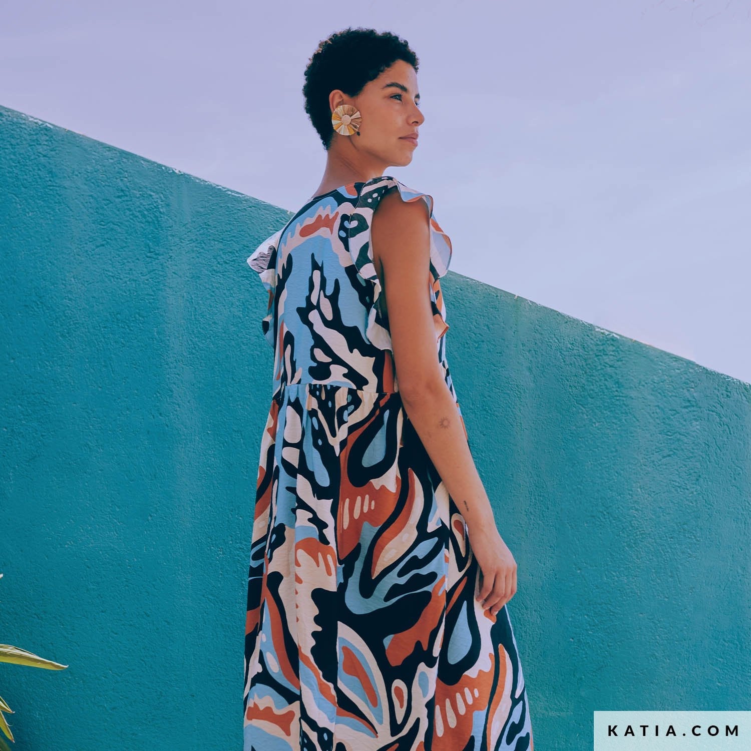 O țesătură ușoară, fluidă, cu aspect ușor creponat, care se drapează frumos, cu imprimeu abstract in stil african, in nuanțe de cărămiziu, turcoaz, crem și negru - recomandată pentru cusut rochii sau bluze ușoare de primăvară/vară.