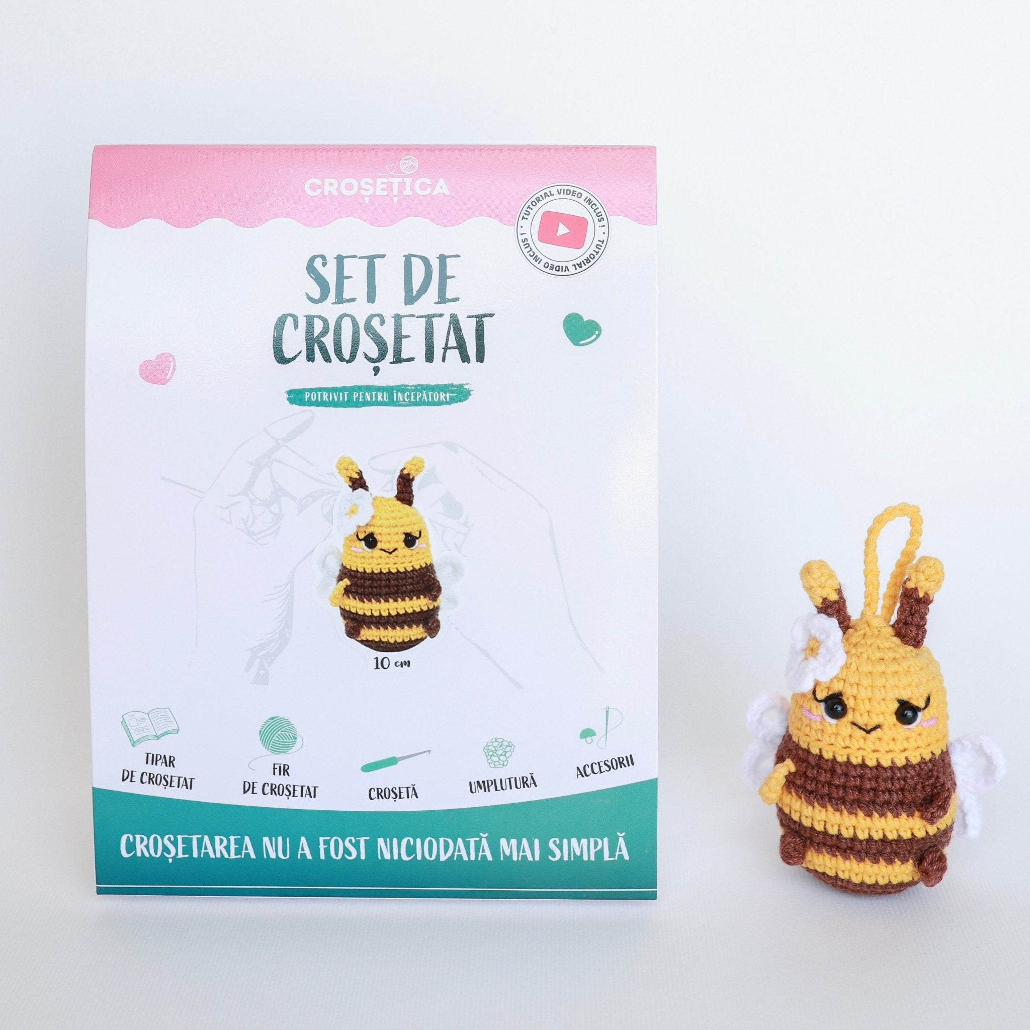 Kit-ul perfect pentru începători și cei curioși să experimenteze noi tehnici de croșetat - noul set de la Croșetica vine cu tot ce vă trebuie pentru a croșeta o jucărioară adorabilă: fire multicolore, croșetă, ac bont pentru finisare, ochișori, umplutură și pliant cu instrucțiuni detaliate in limba română. Acesta din urmă conține și link către tutorialul-video pas-cu-pas, care vă va îndruma pe parcursul activității.