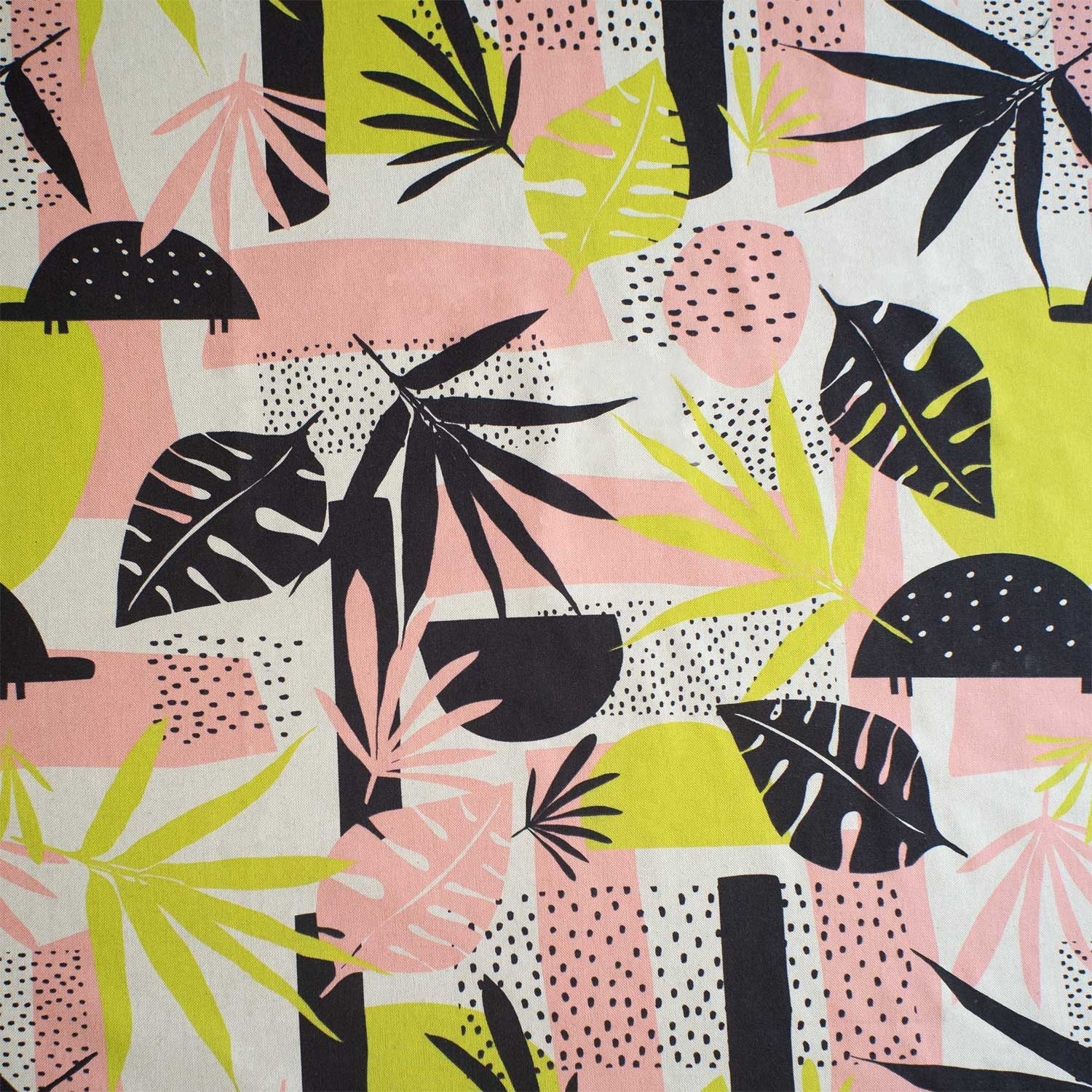 Un model abstract in nuanțe contrastante de roz somon, verde fistic și gri antracit, cu imprimeu de frunze suprapuse pe elemente geometrice, pe fundal bej natur. Bumbacul Canvas este potrivit in special pentru genți, rucsacuri, perne și decorațiuni.