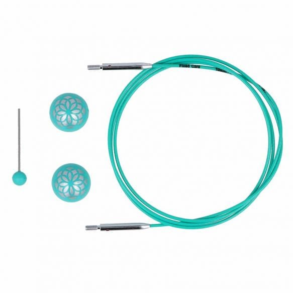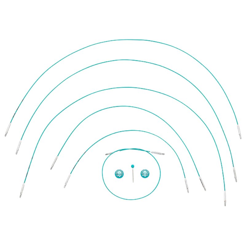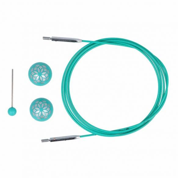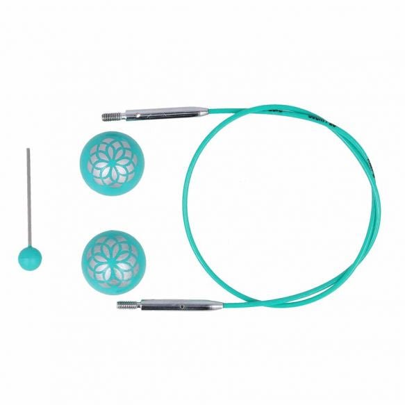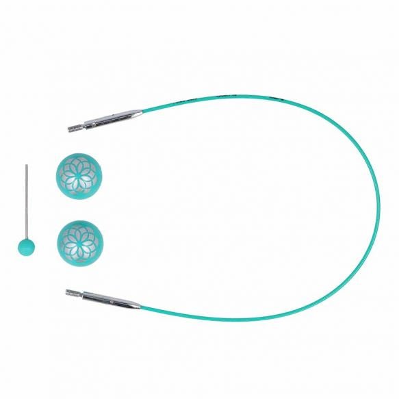 Cablurile de oțel din colecția Mindful by KnitPro sunt compatibile cu toate capetele de andrele produse de KnitPro. Colorate in nuanța specifică gamei Mindful - un turcoaz deosebit, cablurile rămân intinse și nu se incolăcesc in timpul lucrului datorită sistemului rotativ la 360 grade de la punctul de joncțiune. Cablurile se fixează ușor și bine pe capetele de andrele, astfel vă vor garanta ore de tricotat cu plăcere, fără ca ochiurile să se agațe la trecerea de pe andrea pe cablu. Fiecare cablu vine in set cu 2 opritoare cu model simpatic floral tip mandala și cu o cheiță de fixare. Lungimea cablului este indicată in primul rând, urmată de lungimea totală de lucru obținută impreună cu andrelele. Cablurile sunt disponibile in mărimi de la 40 cm și până la 150 cm (cu referință la lungimea totală de lucru), și pot fi extinse pe lungime prin folosirea conectoarelor, ce pot fi achiziționate separat.