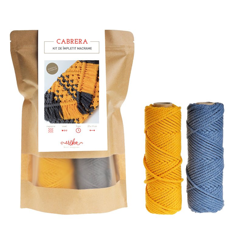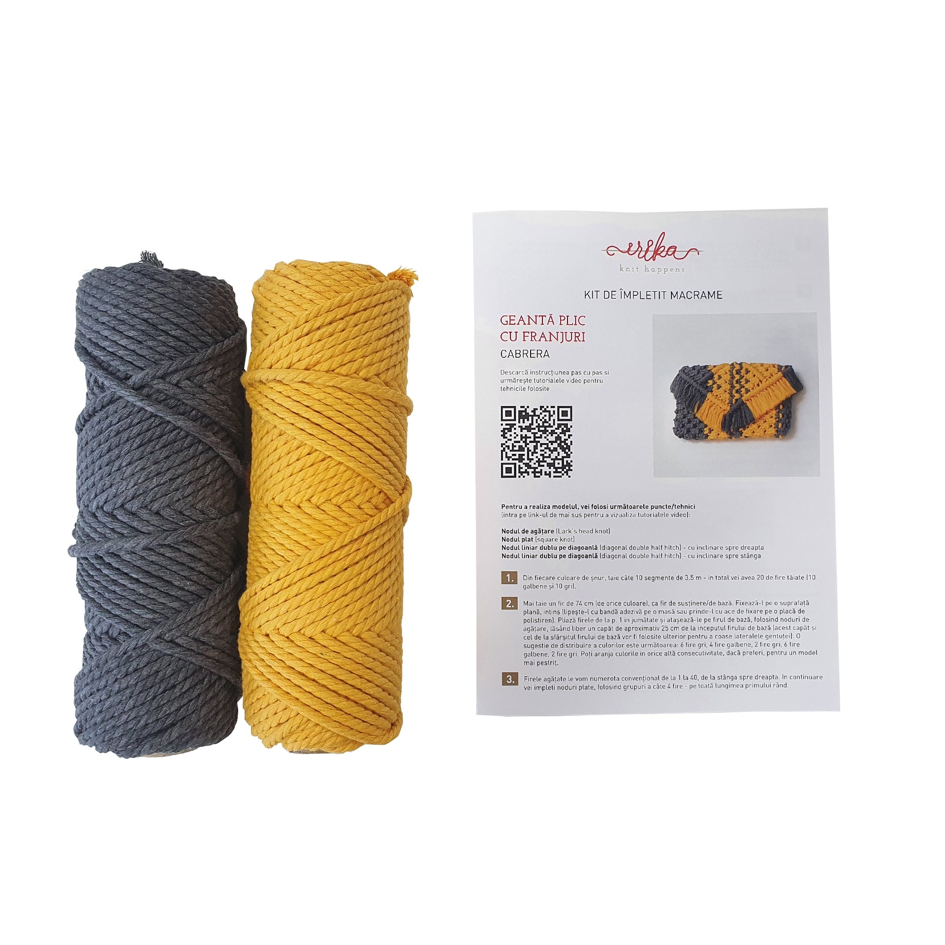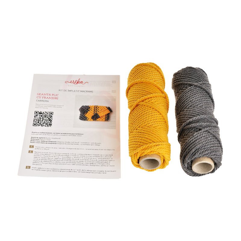 Un proiect indrăzneț și stilat, pentru cei care sunt gata să invețe o tehnică nouă de impletit noduri macrame - modelul de geantă-plic Cabrera a fost creat de designer-ii de la marca spaniolă Katia. Kit-ul conține șnururi răsucite pentru macrame, pe 2 nuanțe contrastante și un pliant cu instrucțiuni pas-cu-pas, in limba română. Acestea sunt disponibile și pe blogul nostru, in format electronic, cu link-uri spre tutoriale video cu tehnicile utilizate in proiect. Dimensiunile finale ale genții-plic sunt de aproximativ 23 cm x 12 cm, in format inchis.