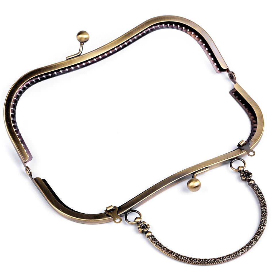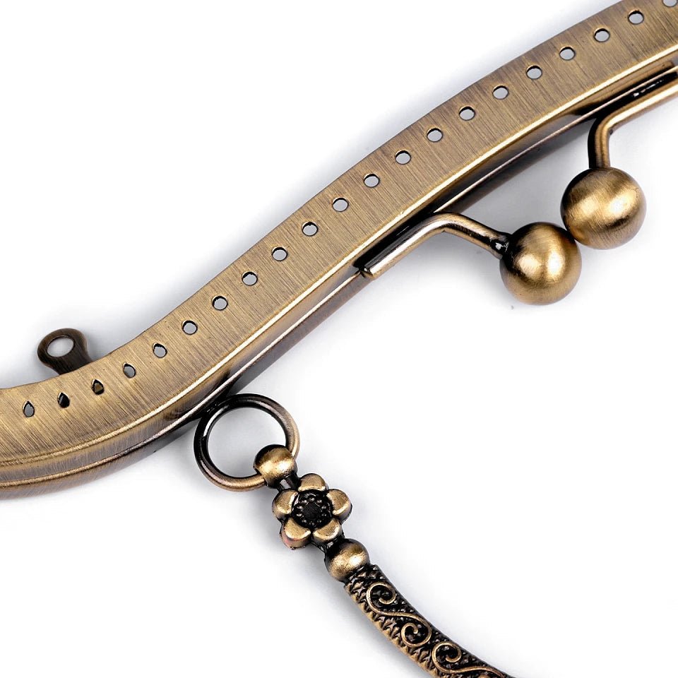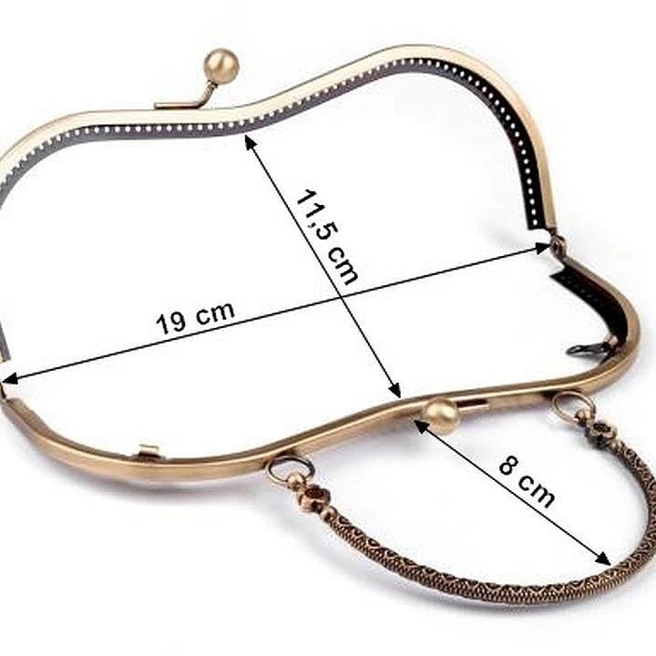 Un cadru metalic cu finisaj de aur antichizat, elegant și stilat, pentru poșete croșetate, tricotate sau impâslite din fibre de lână. În format inchis, cadrul măsoară 19 cm la bază, pe interior, și 6.5 cm înălțime. Mânerul cadrului are 8 cm. Cadrul se montează pe corpul poșetei prin coasere, având perforații cu diametru de 3 mm pe întreg perimetrul.