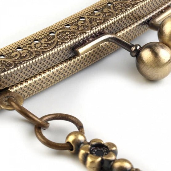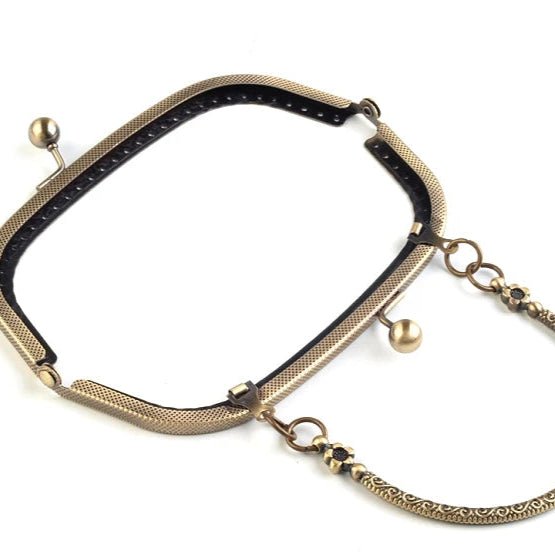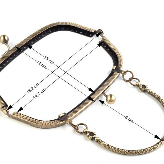 Un cadru metalic cu finisaj de aur antichizat, elegant și stilat, pentru poșete de mici dimensiuni - croșetate, tricotate sau impâslite din fibre de lână. În format inchis, cadrul măsoară 16 cm la bază și 6.5 cm înălțime. Mânerul cadrului are 8 cm. Cadrul se montează pe corpul poșetei prin coasere, având perforații cu diametru de 3 mm pe întreg perimetrul.
