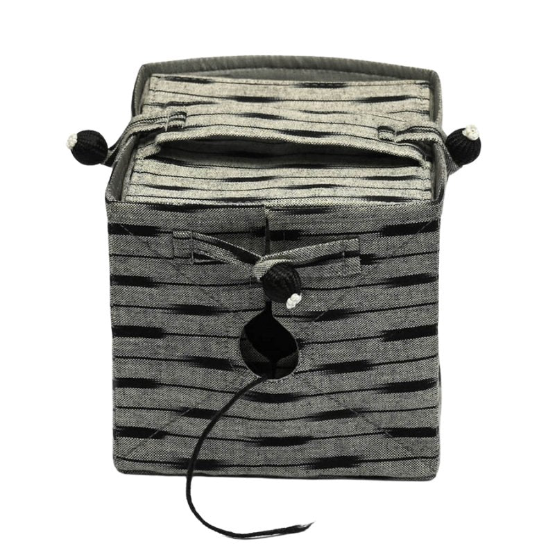 Alternativa clasicului bol pentru gheme este cutia pliabilă din țesătură satinată cu imprimeu obținut prin tehnica tradițională Ikat - produsă special pentru colecția de huse de la Lantern Moon - țesută din fibre vopsite separat printro tehnică specială, care produc un model abstract deosebit pe materialul obținut. Cutia este formată din 2 părți - baza și capacul - care se prind intre ele cu ajutorul unor nasturi decorativi cu bucle. Pe partea frontală, firul de la ghem iese printro gaură specială, care permite să trageți ușor de el in timpul tricotatului sau croșetatului. Cutia asamblată are latura de 12.5 cm.