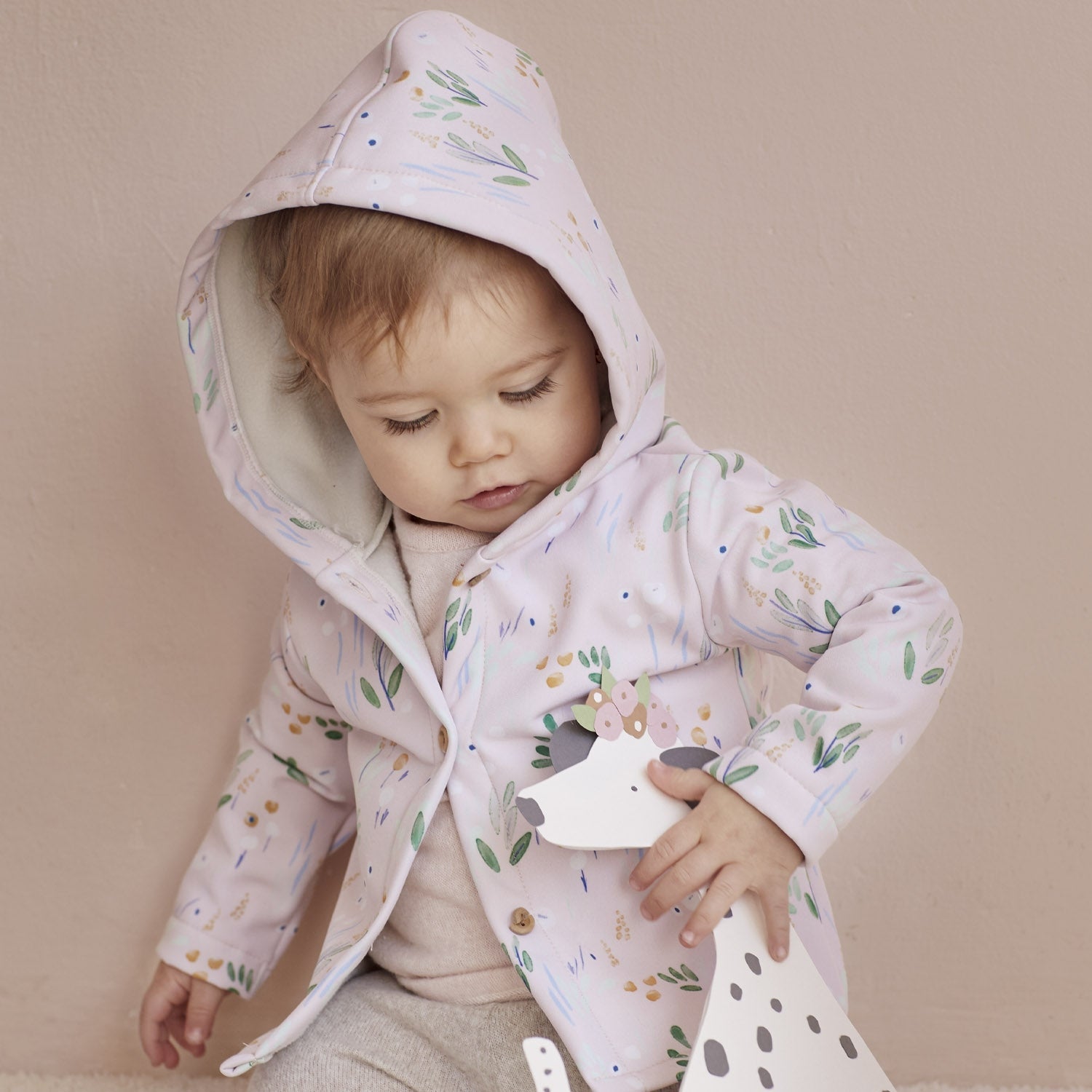 Un model abstract cu imprimeu de floricele in nuanțe pastelate, pe fundal roz pudrat. Țesătura rezistentă de poliester este dublată cu material polar, astfel fiind perfectă pentru jachete, hanorace și salopete călduroase de toamnă/iarnă.
