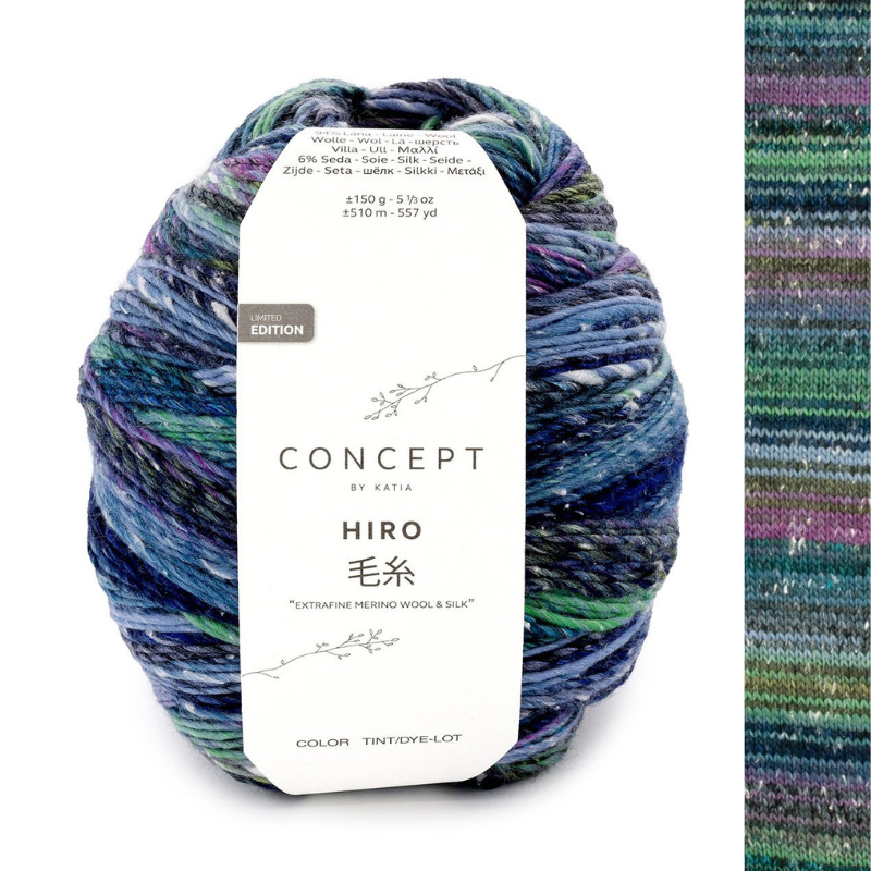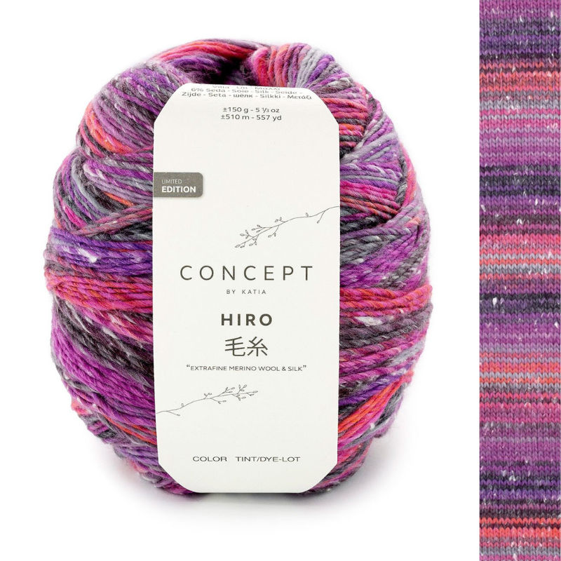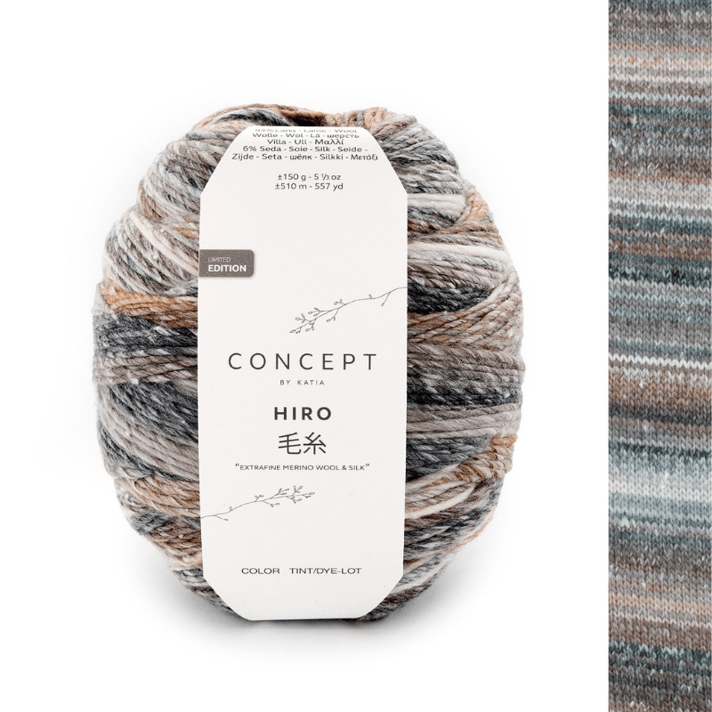 Firul Hiro din gama premium Concept de la Katia aduce farmecul creațiilor artizanale, cu combinația perfectă între merinosul extrafin (94%) și mătasea naturală (6%). Fin și moale la atingere, firul este răsucit din fibre multicolore de lână, cu picățele delicate de mătase în culoare naturală, pentru șaluri și pulovere de efect. Hiro se prezintă în bobine de 150 g, cu o lungimea generoasă de aproximativ 510 m. O singura bobină este suficientă pentru a tricota un șal , iar cu 2 bobine se poate lucra un pulover de mărimea M, pe andrele de 3 - 3.5 mm.