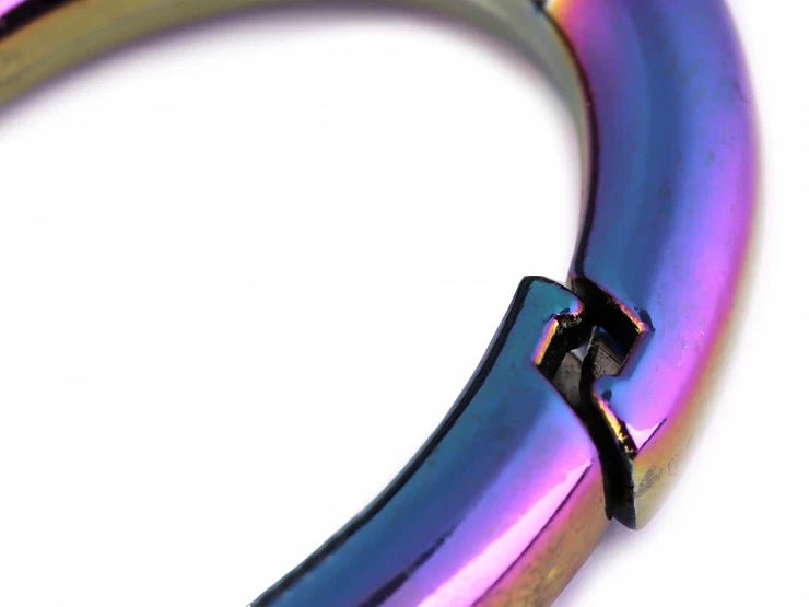 Set din 2 inele zincate, cu diametru exterior de 37 mm și interior de 25 mm, cu sistem facil de prindere - perfecte pentru genți, rucsacuri sau brelocuri. Finisajul policromatic, cu efect de curcubeu, va accesoriza frumos orice piesă croșetată. Inelele au o grosime de aproximativ 6 mm.
