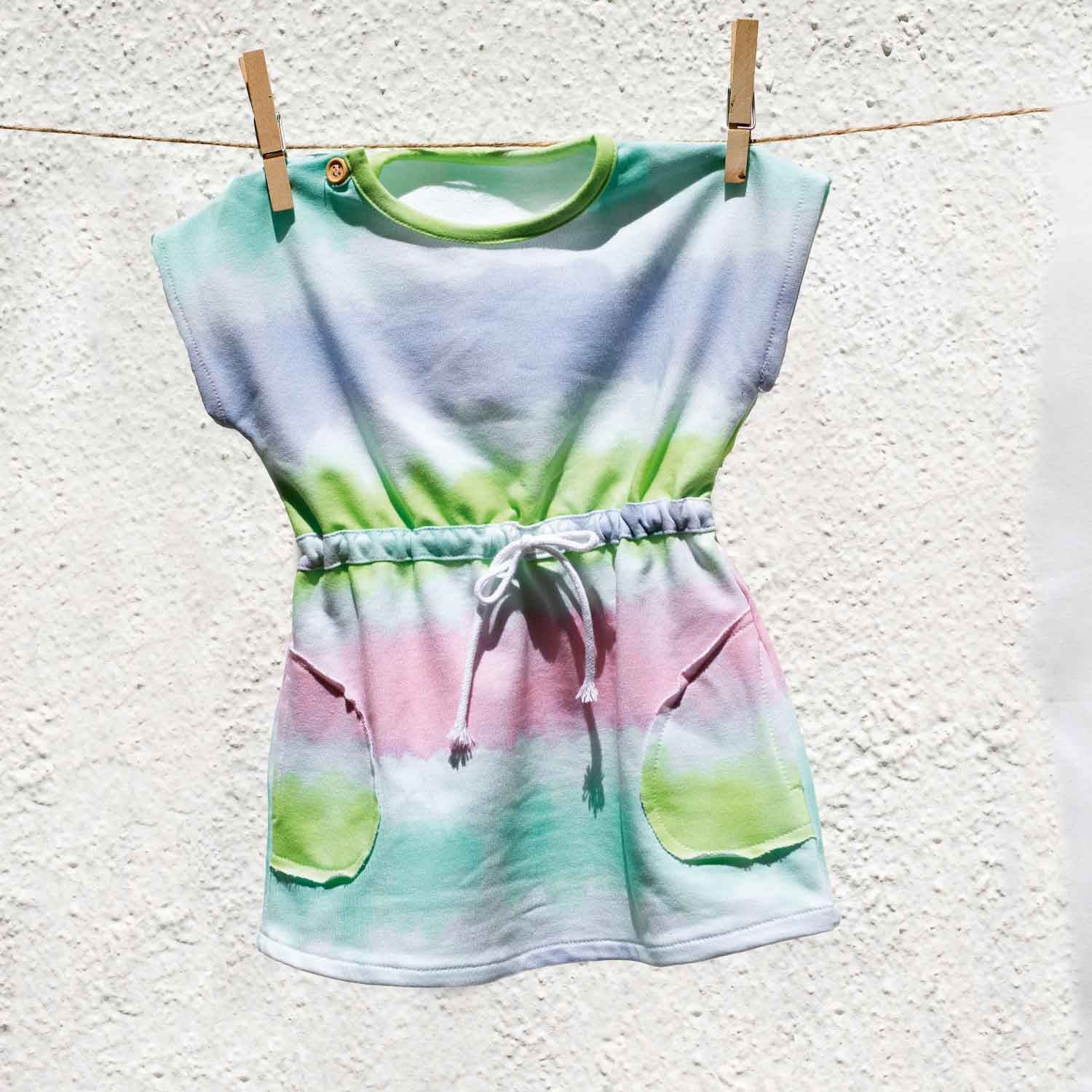 Nuanțe pastelate pe un imprimeu tip ”tie dye” pe un material moale, elastic și foarte confortabil - perfect pentru pantaloni, fustițe, tunici, hanorace sau tricouri confortabile. Potrivit pentru garderoba de primăvară-vară a copiilor și adulților, jerseul flaușat se intreține foarte ușor și este foarte practic.