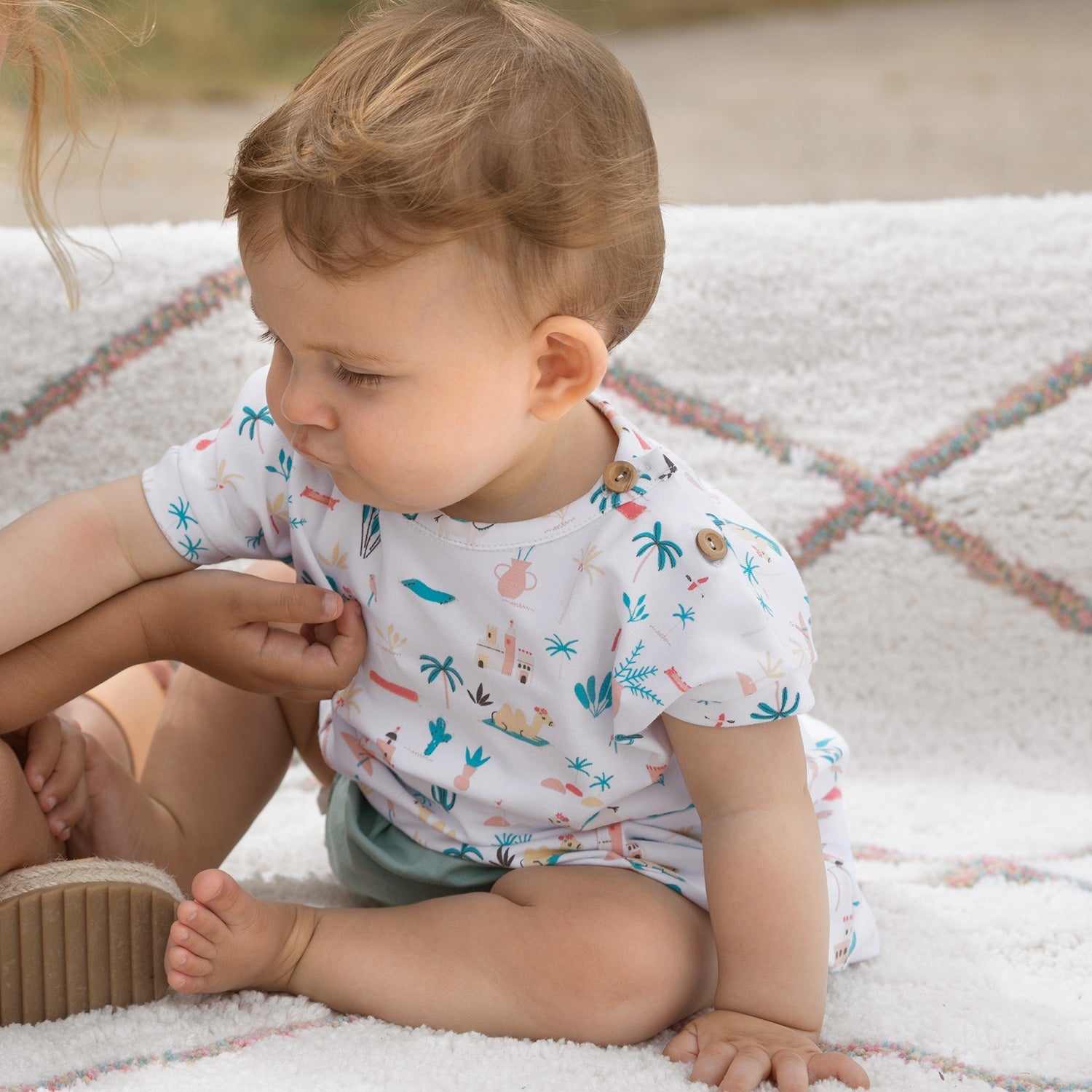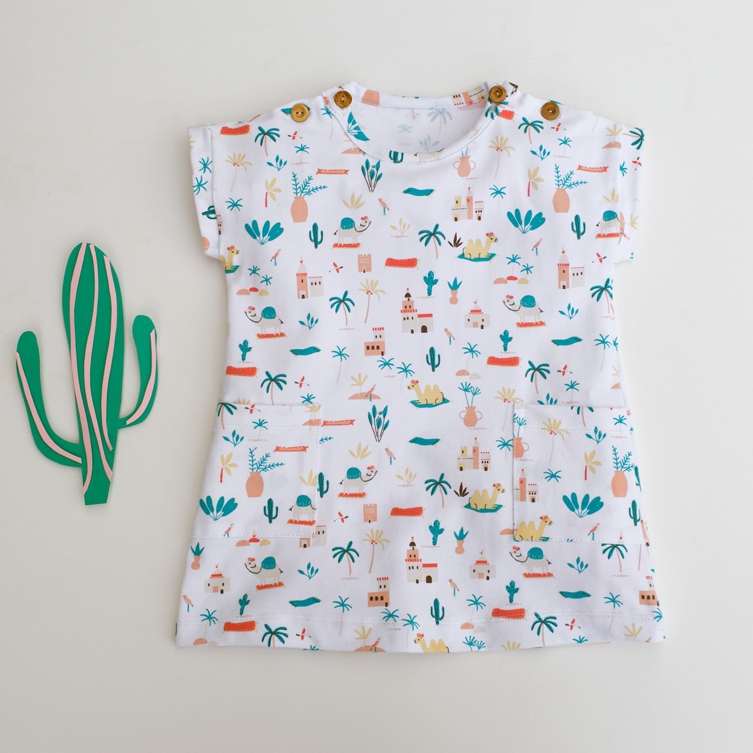 Un model drăguț cu imprimeu inspirat din lumea poveștilor despre Aladdin, in nuanțe de verde jad, crem și corai pe fundal alb. Jerseurile sunt foarte comode și plăcute pe piele, de aceea sunt recomandate pentru articole vestimentare (tricouri, salopete, topuri) și accesorii (bandane, bentițe) - atât pentru copii cât și pentru adulți.