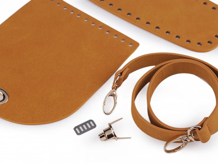 Un set complet cu accesorii pentru finisarea unei poșete croșetate - cu bază ovală de 20 cm x 9 cm și cu 34 de găuri perforate pe perimetru, o clapetă de 15 cm x 17 cm cu perforații pe latura dreaptă și cu sistem de inchidere pe față, precum și o baretă cu carabine, cu lungimea de 82 cm. Găurile perforate au diametru de 5 mm, astfel facilitând croșetarea corpului genții. Carabinele și sistemul de inchidere au finisaj auriu elegant.
