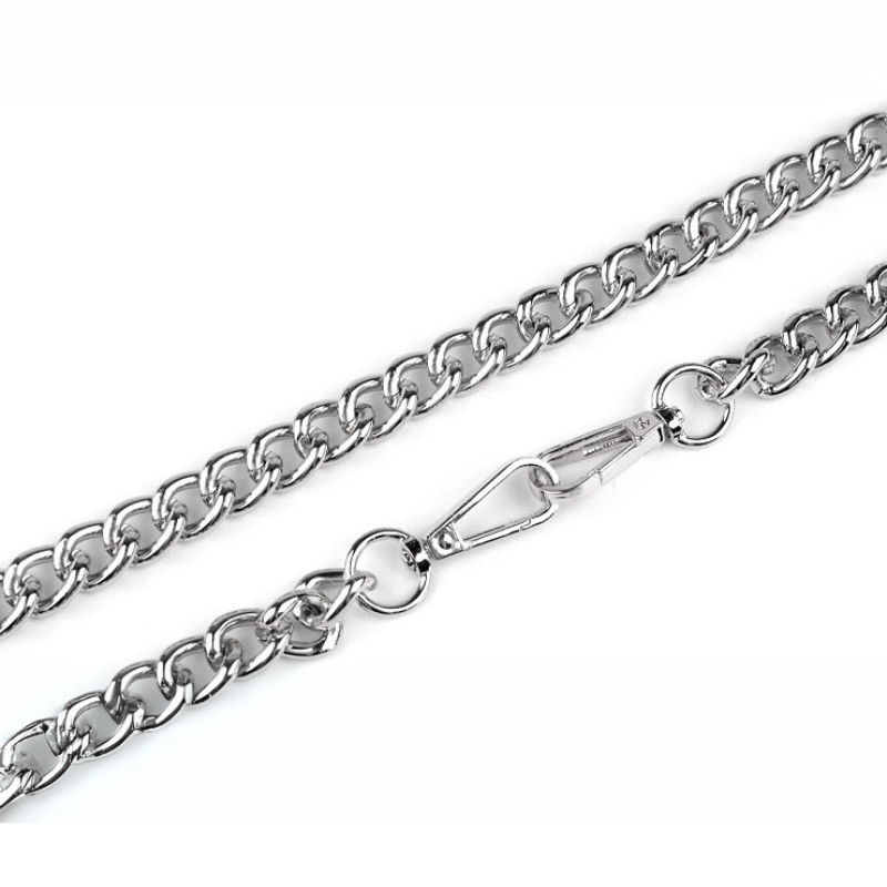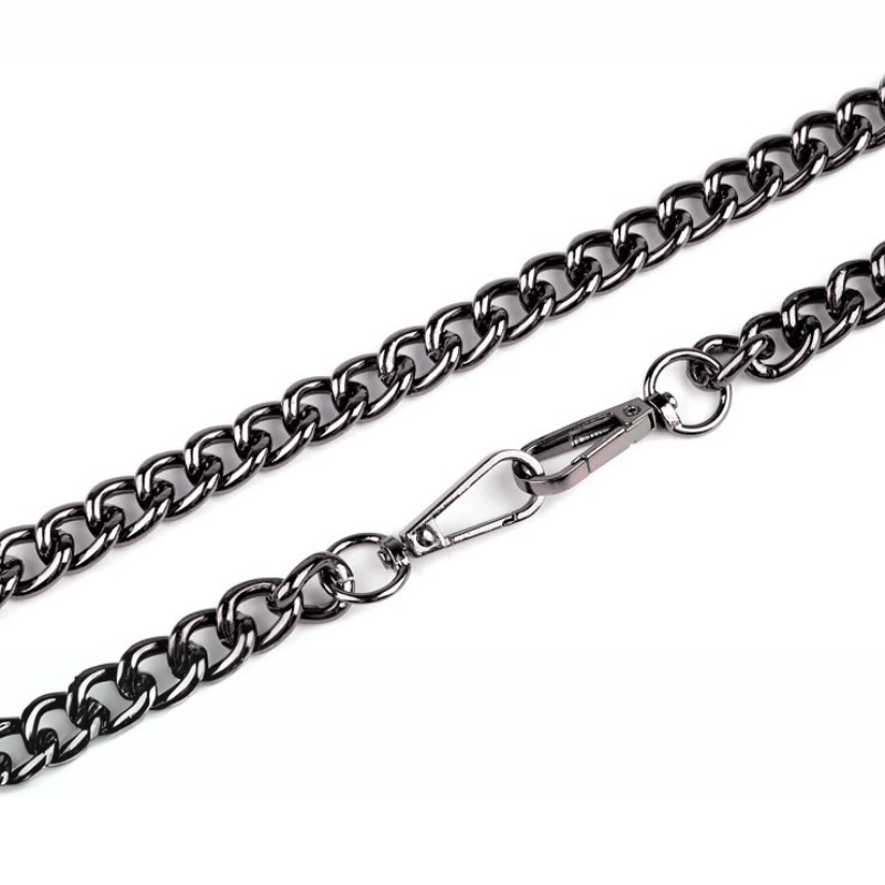 Lanț metalic cu zale medii de 15 mm și lungime de 120 cm, cu carabine mari la capete, pentru o fixare ușoară pe genți sau poșete. Lanțurile sunt disponibile in mai multe variante de finisaj de metal: argintiu, auriu sau negru lăcuit.