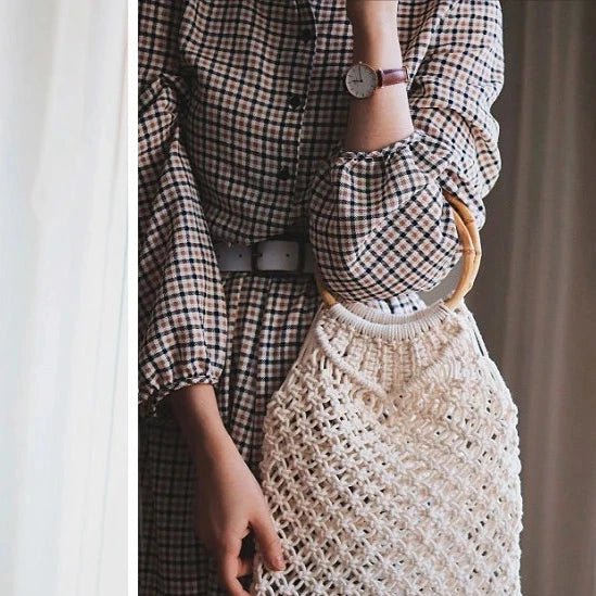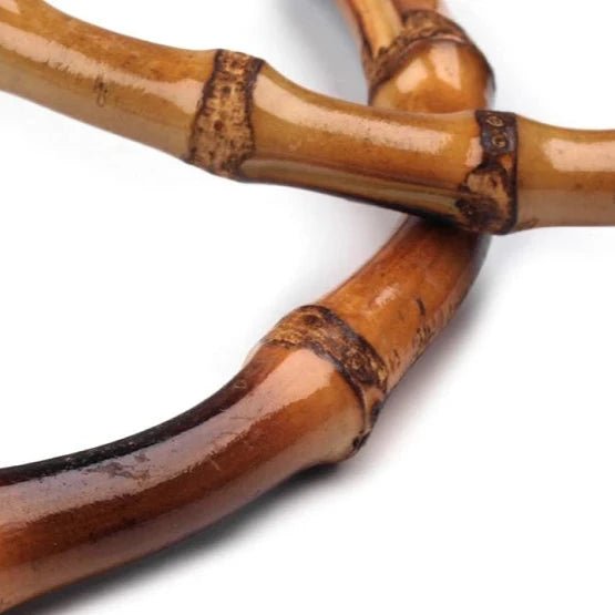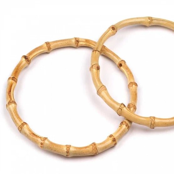 Set din 2 mânere mici rotunde de bambus, cu diametru exterior de 15 cm și grosime de 7-13 mm, cu aspect texturat și finisaj lăcuit. Mânerele pot fi cusute ușor pe genți sau sacoșe croșetate din șnururi de bumbac, din benzi textile sau din rafie.