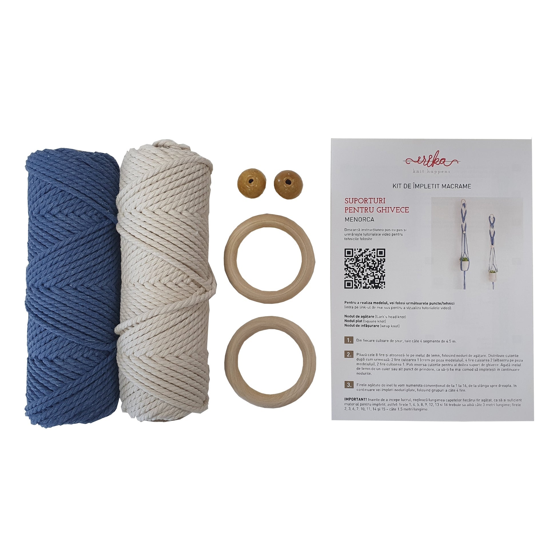 Decorați-vă casa in stil boho-chic, cu suporturi impletite din șnururi răsucite, in 2 culori contrastante. Cu kit-ul MENORCA veți invăța o tehnică nouă de impletit noduri macrame și veți realiza 2 suporturi de aproximativ 110 cm lungime. Modelul a fost elaborat de designer-ii de la marca spaniolă Katia, iar kit-ul conține șnururi răsucite pentru macrame, pe 2 nuanțe (crem și albastru jeans), 2 mărgele de lemn și 2 inele de lemn, precum și un pliant cu instrucțiuni pas-cu-pas, in limba română. Acestea sunt disponibile și pe blogul nostru, in format digital, cu link-uri spre tutoriale video cu tehnicile utilizate in proiect.