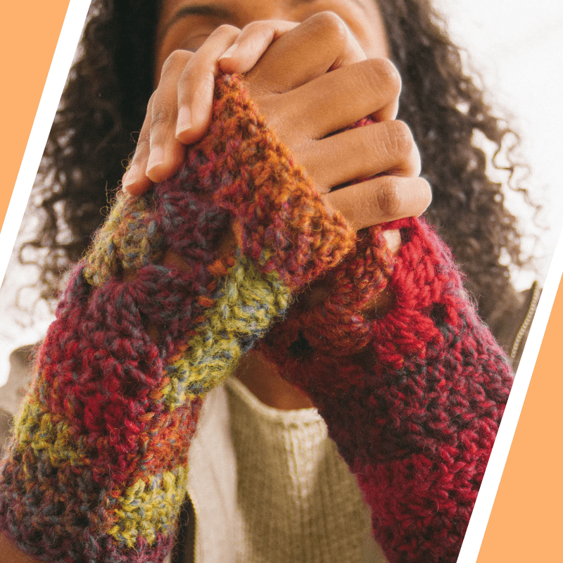 Iată un proiect simplu care pune în aplicare tehnica pătratului croșetat (granny square) - atât de versatilă și interesantă, încât se poate folosi pe o varietate mare de modele: de la accesorii simple și până la haine sau decorațiuni de casă. Pentru aceste mănuși vei avea nevoie de un ghem de fir multicolor de lână - Azteca - și o croșetă de 6 mm. Mănușile sunt construite din câte 2 pătrate croșetate, care se cos pe o latură, urmând apoi să croșetezi mâneca și marginea de jos a mănușilor. Modelul este potrivit celor care au cunoștințe de bază - știu să croșeteze ochiuri de lanț, piciorușe simple, semiduble și duble, și pot urma o schemă cu simboluri.