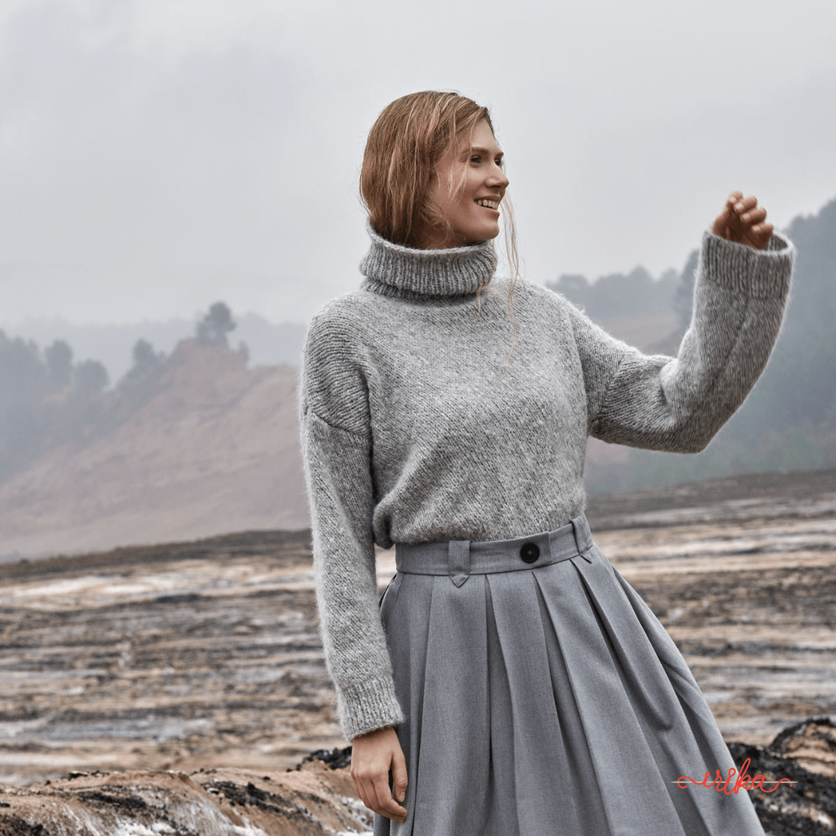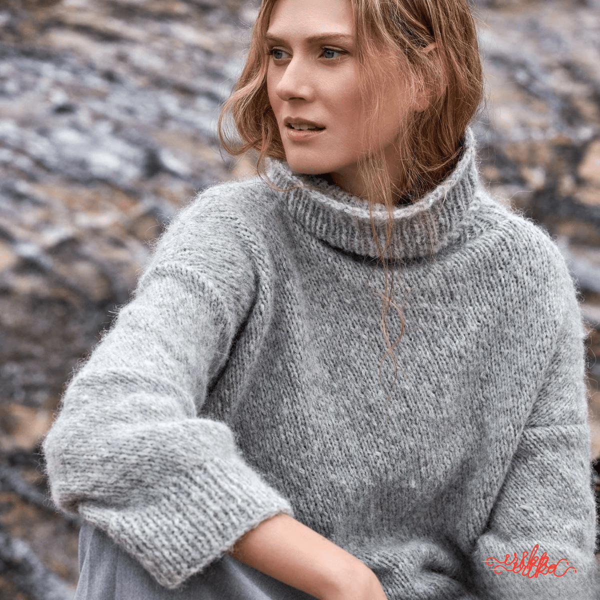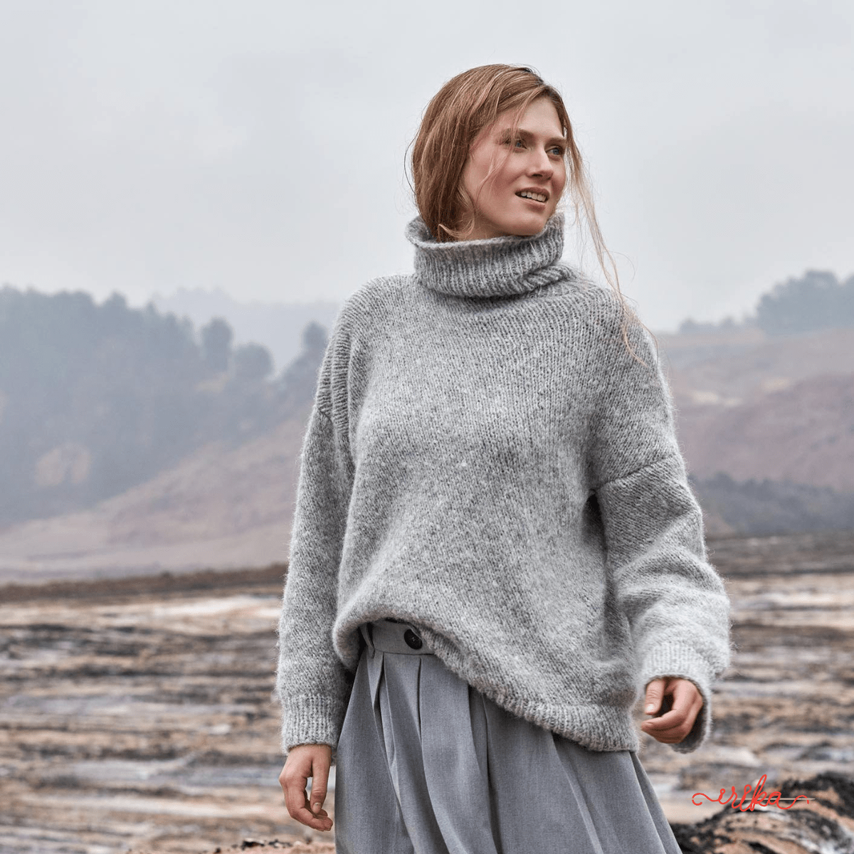 Un model de pulover pufos și călduros, reinterpretat pe un croi modern - lucrat pe diagonală - cu mâneci largi și guler înalt, perfect pentru sezonul rece. Acest pulover etse tricotat pe andrele de 5.5 mm din fire Light Alpaca Merino din colecția Concept by Katia, necesarul de fire fiind de 350 g (7 gheme) pentru mărimea S, 400 g (8 gheme) pentru mărimea M și 450 g (9 gheme) pentru mărimea L. Proiectul este potrivit începătorilor care cunosc tehnicile de bază - montarea ochiurilor, tricotat pe față și pe dos, scăderi și creșteri simple, închiderea ochiurilor.