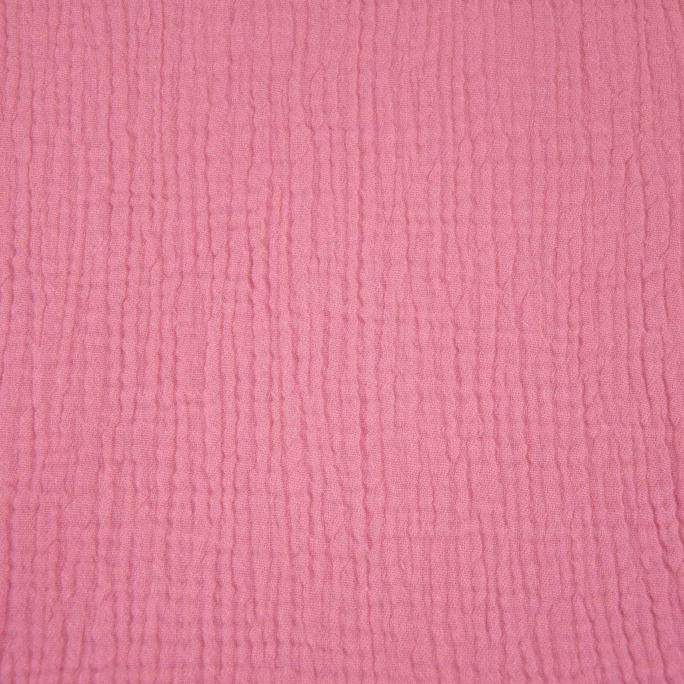 Muselină dublă cu aspect prespălat și textură foarte moale, de nuanță roz trandafiriu. Muselina este o țesătură fină de bumbac 100%, plăcută pe piele, cu un finisaj mat, potrivită pentru bluze, cămăși, rochii, topuri și accesorii destinate adulților și copiilor.