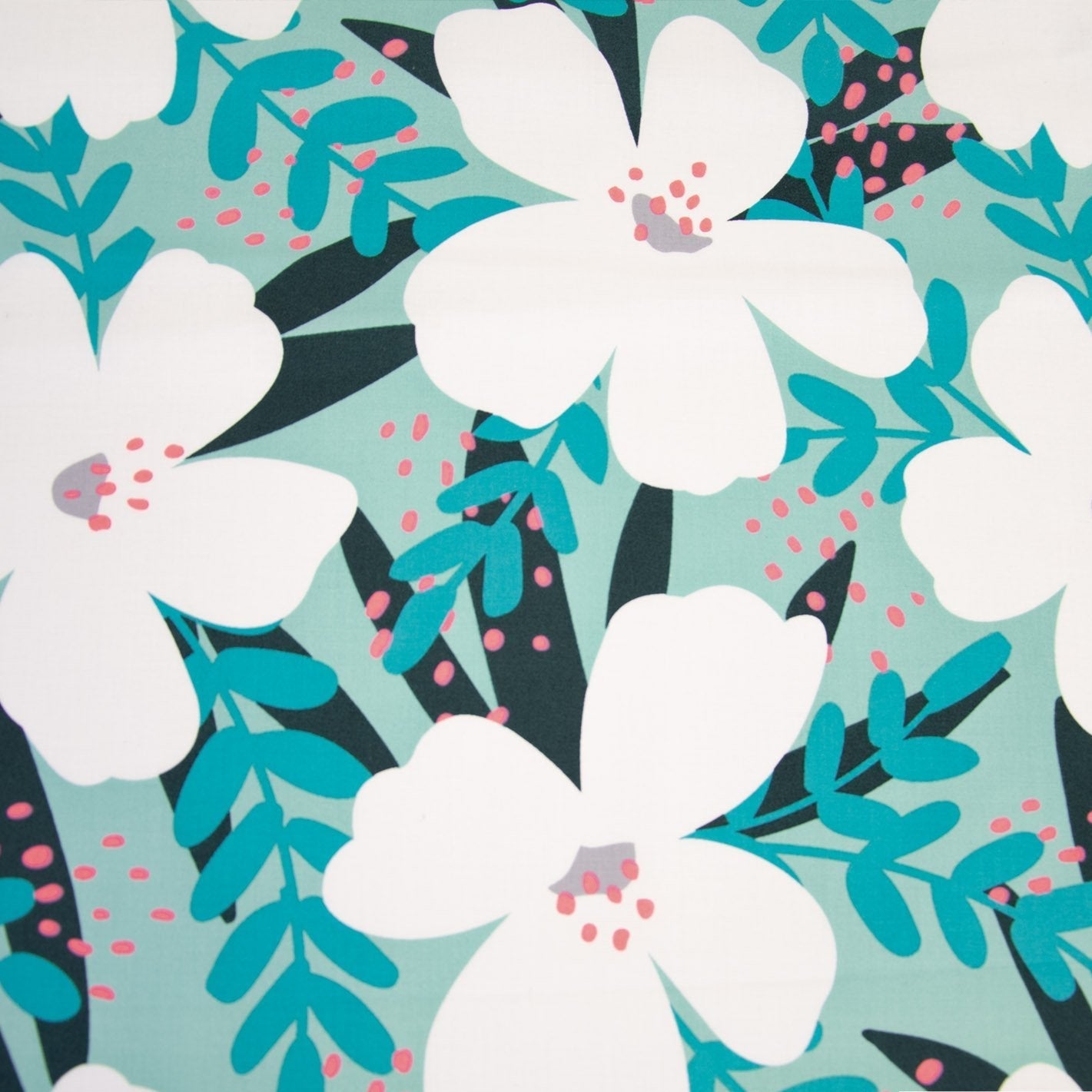 Un poplin cu imprimeu cu flori mari albe și frunze in nuanțe de vernil și verde, cu detalii mici roz neon, perfect pentru articole lejere de primăvară-vară. Materialul este certificat OEKO-TEX 100, are un finisaj moale și plăcut, fiind potrivit chiar și persoanelor cu pielea foarte sensibilă. Poplinurile sunt țesături ușoare, cu un aspect semilucios, recomandate pentru bluze, fuste, rochițe, și alte articole vestimentare ușoare.