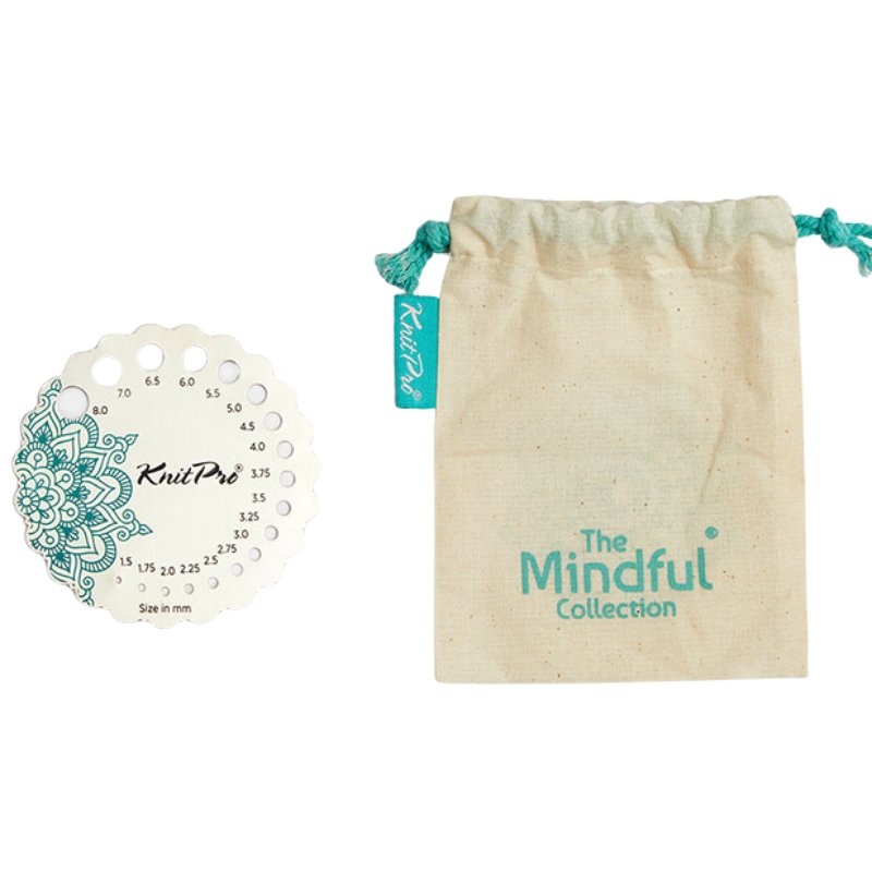 Un dispozitiv foarte util in trusa de lucru manual - rigla placată cu argint pentru măsurat andrele, din gama Mindful by KnitPro, are o formă rotundă și decupaje exacte pe perimetru. Cu ajutorul riglei puteți verifica rapid diametrul andrelelor, cu mărimi cuprinse intre 1.5 mm și 8 mm, inclusiv și mărimi cu sferturi (1.75 mm, 2.25 mm, 2.75 mm, 3.25 mm și 3.75 mm). Rigla este decorată frumos cu model floral tip mandala, specific gamei Mindful, și este ambalată intro husă textilă cu șnur.