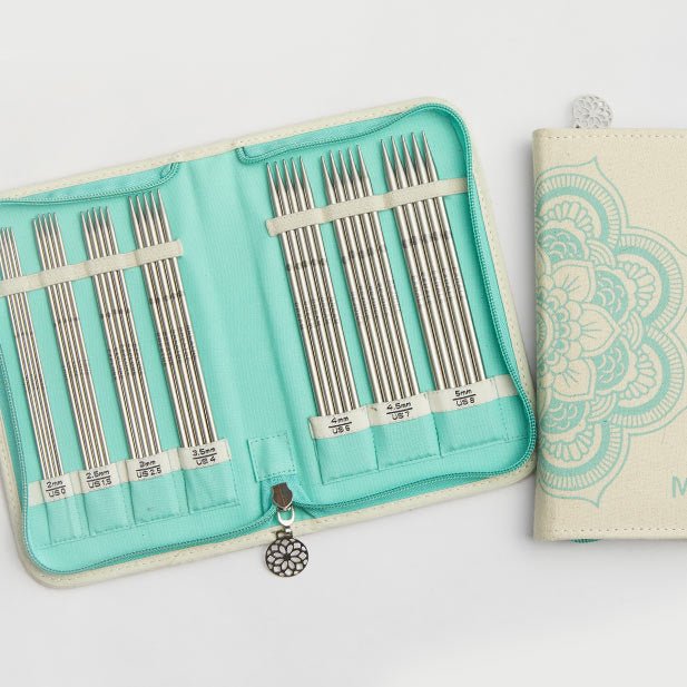 Setul GRATEFUL din colecția Mindful by KnitPro conține 7 seturi a câte 5 andrele duble de 15 cm cu diametrele cele mai des folosite: 2 mm, 2.5 mm, 3 mm, 3.5 mm, 4 mm, 4.5 mm și 5 mm. Setul conține și accesorii foarte utile: o riglă de măsurat diametrul andrelelor, 2 ace de finisare și 30 de marcatoare (inclusiv 10 rotunde, 10 marcatoare de tip deschis și 10 marcatoare cu inchidere). Toate acestea sunt prezentate intro husă textilă, tip penar, cu model floral pe copertă, care se inchide cu fermoar. In interior, veți mai găsi o husă mică pentru accesorii. Intregul set este ambalat intro husă textilă exterioară suplimentară, in care puteți păstra și alte accesorii de tricotat.