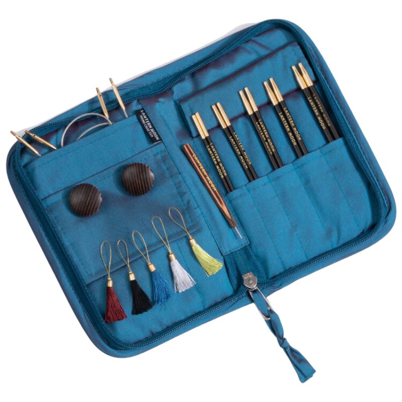 Setul conține 5 perechi de capete standard de andrele, cu lungimea de 13 cm, cu cele mai des folosite diametre: 3 mm, 3.5 mm, 4 mm, 4.5 mm și 5 mm. Elementele de conectare pe capetele de andrele și pe cabluri sunt placate cu aur de 24 carate, iar mărimile sunt atât gravate pe aceste elemente cât și imprimate pe corpul andrelelor. Veți găsi de asemenea in set și 2 cabluri de oțel acoperite cu nailon, cu element rotativ (astfel cablul nu se va incolăci niciodată in timpul tricotatului), pentru a obține 2 lungimi de lucru - de 60 cm și de 80 cm (inclusiv capetele de andrele). Acestea vă vor permite să tricotați atât articole mai mari, cât și accesorii cu circumferință redusă (de exemplu căciuli sau haine pentru copii) - pentru care puteți folosi metoda ”Magic Loop” pentru a obține diametrele mai mici. Setul mai conține 4 opritoare de lemn, 2 chei de fixare și 5 marcatoare colorate - toate aceste accesorii fiind indispensabile pentru a vă organiza procesul de lucru manual, indiferent dacă tricotați acasă sau călătoriți. Ca și toate seturile de tricotat și croșetat de la Lantern Moon, setul CHARM este prezentat intro husă elegantă din țesătură Khadi de mătase naturală fină, cu fermoar și buzunare interioare.