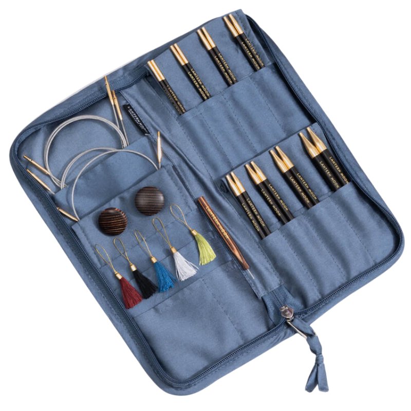 Setul GLORY de andrele interschimbabile din lemn de abanos de la Lantern Moon este varianta universală din punct de vedere al funcționalității și al stilului - o alegere foarte reușită pentru pasionații de tricotat care apreciază luxul și confortul de a lucra pe andrele de abanos. Setul conține 8 perechi de capete standard de andrele, cu lungimea de 13 cm, cu următoarele diametre: 3 mm, 3.5 mm, 4 mm, 4.5 mm, 5 mm, 5.5 mm, 6 mm și 8 mm. Elementele de conectare pe capetele de andrele și pe cabluri sunt placate cu aur de 24 carate, iar mărimile sunt atât gravate pe aceste elemente cât și imprimate pe corpul andrelelor. Veți găsi de asemenea in set și 3 cabluri de oțel acoperite cu nailon, cu element rotativ (astfel cablul nu se va incolăci niciodată in timpul tricotatului), pentru a obține 3 lungimi de lucru - de 60 cm, de 80 cm și de 100 cm (inclusiv capetele de andrele). Acestea vă vor permite să tricotați atât articole mai mari - pături, pulovere sau cardigane supradimensionate, cât și accesorii cu circumferință redusă (de exemplu căciuli sau haine pentru copii) - pentru care puteți folosi metoda ”Magic Loop” pentru a obține diametrele mai mici. Setul mai conține 4 opritoare de lemn, 2 chei de fixare și 5 marcatoare colorate - toate aceste accesorii fiind indispensabile pentru a vă organiza procesul de lucru manual, indiferent dacă tricotați acasă sau călătoriți. Ca și toate seturile de tricotat și croșetat de la Lantern Moon, setul GLORY este prezentat intro husă elegantă din țesătură Khadi de mătase naturală fină, cu fermoar și buzunare interioare.
