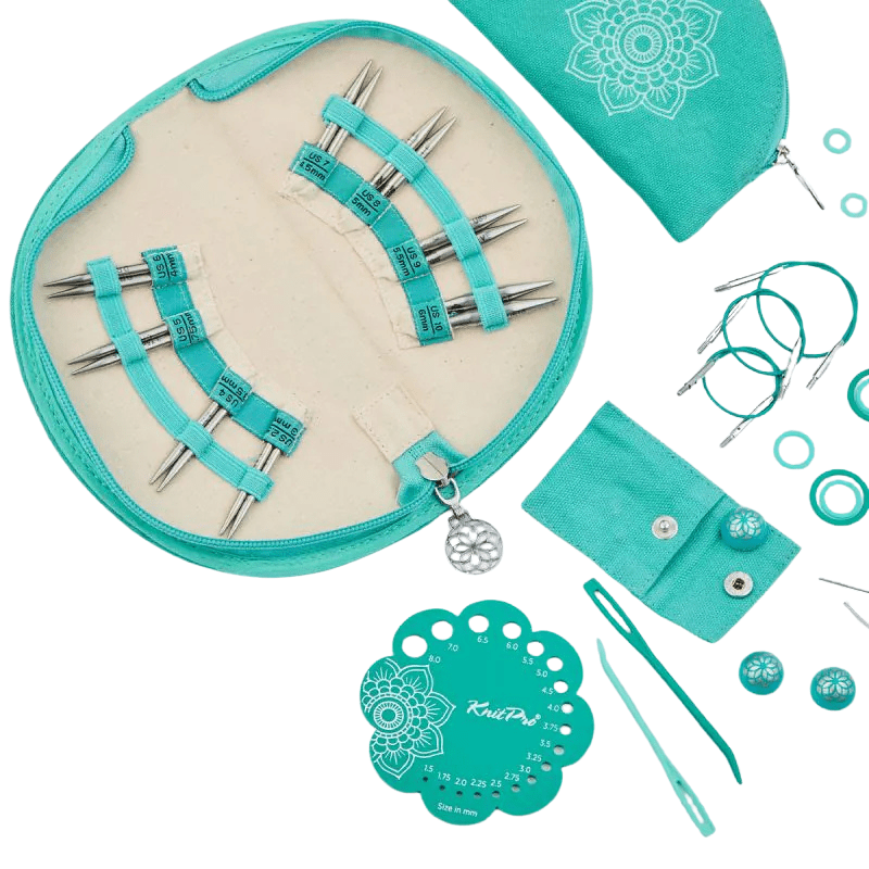 Setul GENEROSITY din colecția Mindful by KnitPro include capete scurte interschimbabile, de 5 cm lungime, potrivite pentru a tricota articole cu diametre foarte mici, cum sunt șosetele, manșetele sau gulerașele la hainele pentru copii, printre altele. Set conține 8 perechi de capete mici de 5 cm cu diametrele de 3 mm, 3.5 mm, 3.75 mm, 4 mm, 4.5 mm, 5 mm, 5.5 mm și 6 mm. Acestea vin la pachet cu 4 cabluri speciale de oțel, cu element rotativ la 360 grade, pentru a obține următoarele lungimi de lucru (inclusiv capetele de andrele): 27 cm (2 buc.) și 30 cm (2 buc.). Adițional, setul conține și accesorii foarte utile: 4 opritoare, 2 chei de fixare, o riglă de măsurat diametrul andrelelor, 2 ace de finisare și 30 de marcatoare de plastic (inclusiv 10 rotunde, 10 marcatoare de tip deschis și 10 marcatoare cu închidere). Toate acestea sunt prezentate intro husă textilă semi-rotundă, tip penar, cu model floral pe copertă, care se închide cu fermoar. In interior, veți mai găsi o husă mică pentru cabluri și accesorii mici. Întregul set este ambalat intro husă textilă exterioară suplimentară, in care puteți păstra și alte accesorii de tricotat.