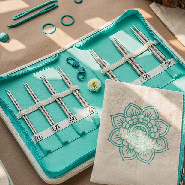 Setul KINDNESS din colecția Mindful by KnitPro conține 7 perechi de andrele interschimbabile scurte de 10 cm cu diametrele cele mai des folosite: 3 mm, 3.5 mm, 4 mm, 4.5 mm, 5 mm, 5.5 mm și 6 mm. Acestea vin la pachet cu 2 cabluri speciale de oțel, cu element rotativ la 360 grade, pentru a obține următoarele lungimi de lucru (inclusiv capetele de andrele): 40 cm și 56 cm. Adițional, setul conține și accesorii foarte utile: 4 opritoare, 2 chei de fixare, 1 pereche de conectoare pentru cabluri (dacă aveți nevoie să măriți lungimea de lucru), o riglă de măsurat diametrul andrelelor, 2 ace de finisare și 50 de marcatoare (inclusiv 30 rotunde, 10 marcatoare de tip deschis și 10 marcatoare cu inchidere). Toate acestea sunt prezentate intro husă textilă, tip penar, cu model floral pe copertă, care se inchide cu fermoar. In interior, veți mai găsi o husă mică pentru cabluri, și un buzunar detașabil pentru accesorii mici. Intregul set este ambalat intro husă textilă exterioară suplimentară, in care puteți păstra și alte accesorii de tricotat.