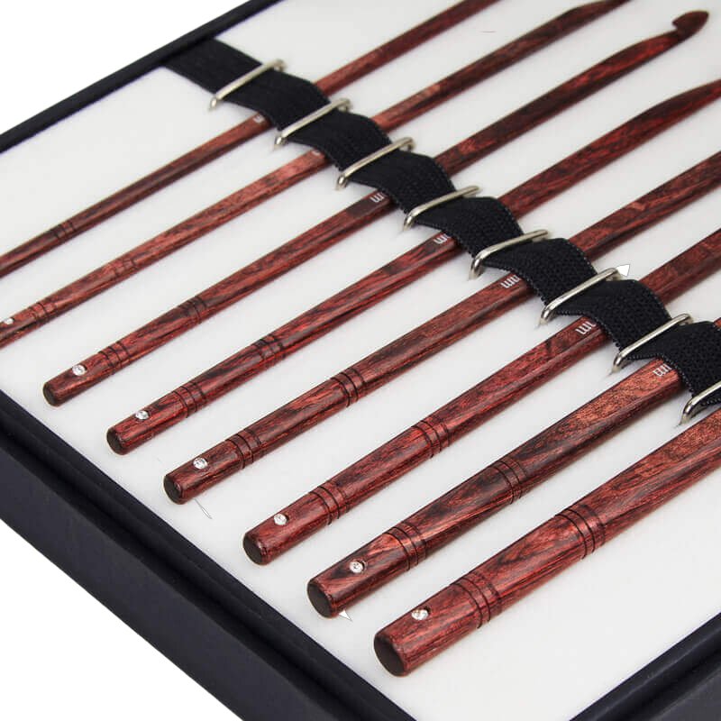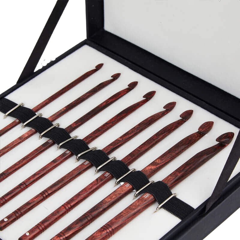 Un cadou ideal pentru pasionații de croșetat - setul de calitate premium de la KnitPro, Symfonie Rose, conține 8 croșete clasice de mărimi diferite, ambalate intro cutie elegantă satinată cu monogramă aurită. Fabricate din lemn de mesteacăn cu densitate mare, laminat, croșetele au urmtătoarele diametre: 3.5 mm, 4 mm, 4.5 mm, 5 mm, 5.5 mm, 6 mm, 7 mm și 8 mm. Acestea au incrustații speciale pe capete, pentru a preveni scăparea ochiurilor in timpul lucrului. Un accent deosebit este și cristalul Swarovski care este fixat pe codița fiecărei croșete - pentru o notă cu totul specială. Deși sunt foarte ușoare, acestea sunt extrem de rezistente și au un finisaj neted pentru o experiență confortabilă.