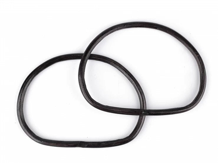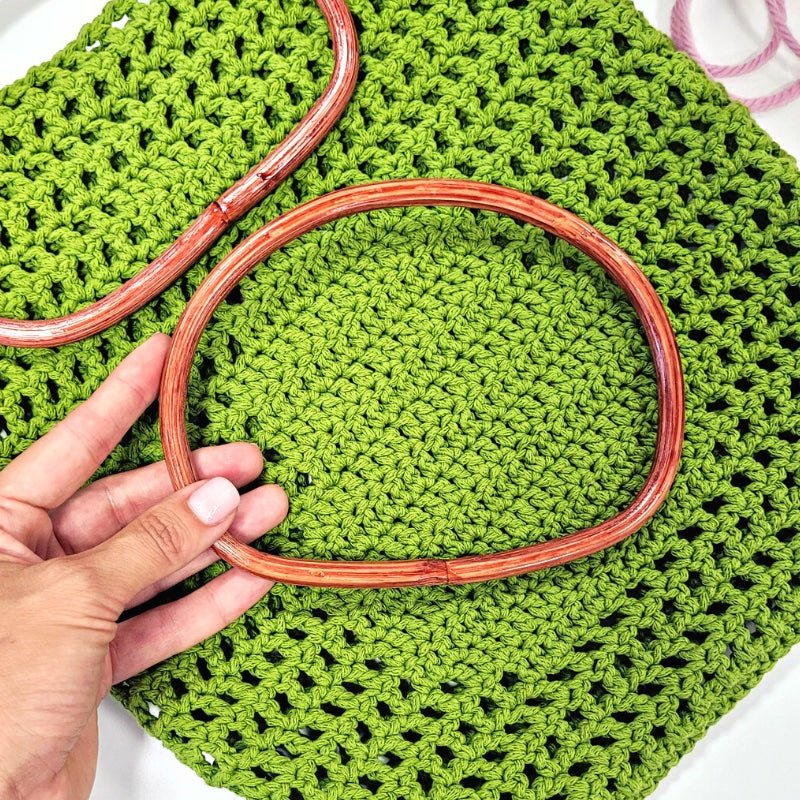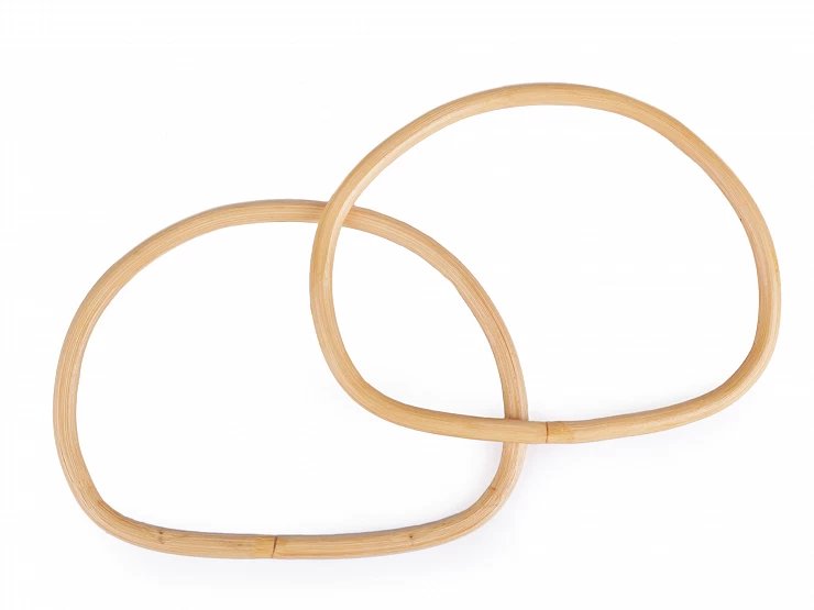 Set cu 2 mânere de bambus, de formă semi-ovală, cu dimensiunile exterioare de 17.5 cm la bază și 14 cm inălțime, cu finisaj neted lăcuit, disponibil in 3 variante de nuanțe: natur, maro caramel și maro intunecat. Mânerele au o grosime de aproximativ 9 mm. Acestea pot fi cusute direct pe geantă, sunt rezistente și ușoare.