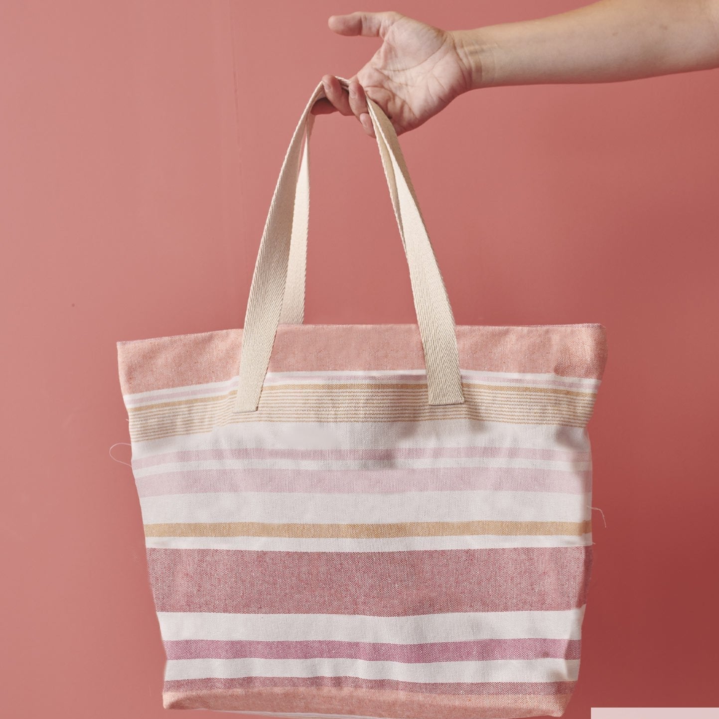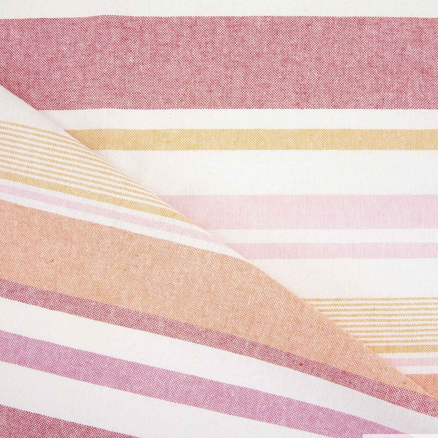 O țesătură cu aspect țesut și imprimeu dungat, pe nuanțe de corai și roz, produsă din fibre de bumbac reciclat și poliester obținut din sticle de plastic reciclate. Țesătura este certificată conform GRS - Global Recycled Standard. Aspectul rustic, finisajul natural și moale, precum și rezistența fibrelor o recomandă pentru sacouri, jachete sau veste de primăvară-vară, precum și pentru decorațiuni (fețe de masă, perne, draperii). La fel de bine, puteți coase genți, sacoșe și rucsacuri din țesătura Canvas.