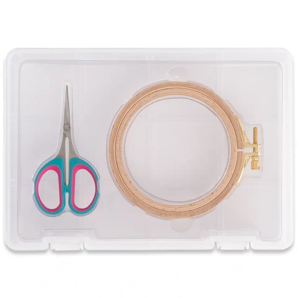 Un set complet cu accesorii funcționale și practice pentru cei curioși să invețe un hobby nou - trusa Prym Love pentru incepători vine echipată cu toate ustensilele necesare pentru a vă apuca de brodat. Cutia incăpătoare și practică, cu 2 secțiuni, conține un set de ace pentru brodat intrun penar special cu magnet, o cariocă aqua-trick pentru a vă desena modelele (marcajul se spală ușor cu apă), un dispozitiv de infirat pentru a vă incărca ușor ața in ac, foarfecă profesională de broderie, un gherghef din lemn de mesteacăn cu diametru de 10 cm, o mică perniță pentru ace, in formă de roșie, și un card pentru organizarea culorilor de ațe din colecția Dvs. Trusa conține și un mic pliant cu instrucțiuni pentru cele mai des folosite puncte de broderie, astfel incât chiar și incepătorii fără experiență să se poată descurca cu un prim proiect.